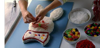 4. Once that is done frost the whole cake with frosting or cool whip and sprinkle the coconut flakes all over. This becomes the bunny's fur. Of you don't like coconut, you can just stick with the frosting, or for a little more work, cover with chocolate flakes. Yum!