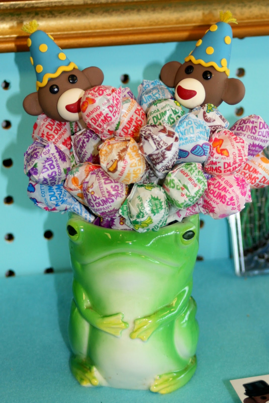 At my last show I came up with a brilliant solution to the art-molestation problem. I took a cute little vintage frog cup I had found at an antique shop. I filled it up with dum-dums (little suckers) and I topped it off with two little sock monkey cupcake toppers which peeked out over the dum-dums.