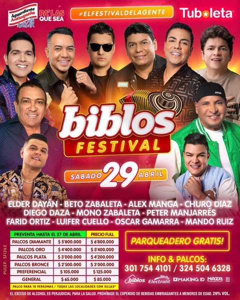 π¨ Este SΓ‘bado 29 de Abril @BiblosFestival #ElFestivalDeLaGente #BiblosEsBiblos EN EL MEJOR SITIO DE VALLEDUPAR!!! π¨ β’ @churo_diaz @elderdayanoficial @betozabaletaceledon @petermanjarres @alexmangaoficial @monozabaleta @diegodazam @faridortizoficial @luifercuello @oscargamarrap @mandoruizr β’ πΌπ€ Los Mejores Artistas π Parqueadero Gratis βοΈβ Accesos y Movilidad Fluida π Precios Mas Bajos!!! β’ πΊπ»ππ» Un Evento Para El Pueblo @biblosfestival @bilalabduls @bryancuadro @manezabaleta @guilleguille90 @makingidbc
