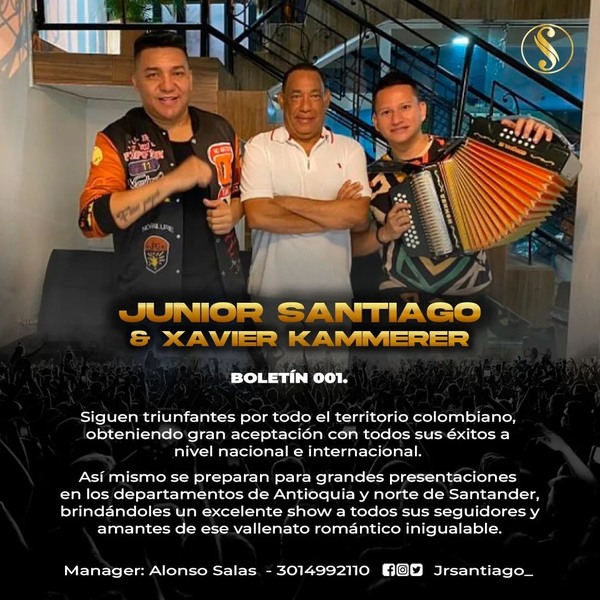 @jrsantiago_ & @xavier_kammerer Siguen triunfantes por todo el territorio colombiano, obteniendo gran aceptación con todos sus éxitos a nivel nacional e internacional. Así mismo se preparan para grandes presentaciones en los departamentos de Antioquia y norte de Santander, brindándoles un excelente show a todos sus seguidores y amantes de ese vallenato romántico inigualable. Manager @alonso.salas.98622 📱3014992110 SM: @cccastro_4