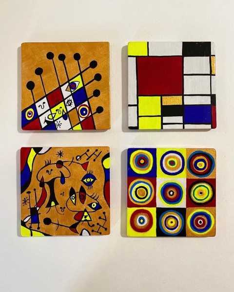 3 Posavasos inspirados en obras de Mondrian, Miró y Kandinsky y una 4 pieza funcionando elementos de los tres artistas al igual que el por de las fotos del final. • Cuánto ame y disfrute demasiado esta paleta de colores, brillante y elegante. Especialmente para este trabajo. • Disponibles en Alemania 🇩🇪 a través de @mango_coco_official • - - - - - #abstractart #abstratismo #astratto #astrattismo #mondrian #miró #kandinsky #art #artwork