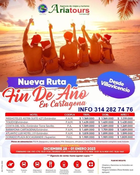Dic 28 - 01 Cartagena volando desde Villavicencio. Info y reservas 3142827476 Of calle 14 Nº 14 - 21 centro Granada. #AriatoursTeLleva