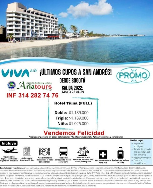 Mayo 25 . 29 San Andres todo incluido en oferta 5 dias 4 noches. Equipaje de 20k, Vuelta a la isla terrestre, acuario, tour bahia y manglares. seguro medico al viajero. Valor p/persona $1.189.000 Info y reservas: 3142827476 Of calle 14 Nº 14 - 21 centro Granada. #AriatoursTeLleva