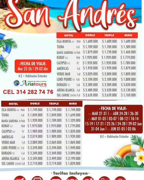 San Andres 5 dias 4 noches todo incluido, maleta de mano y de 20 kilos en bodega, traslaos aeropuerto hotel aeropuerto, tours de cortesia, alimentacion segun el hotel seleccionado y asistencia medica al viajero. Info y reservas 3142827476 Of calle 14 Nº14 - 21 centro Granada. #AriatoursTeLleva.