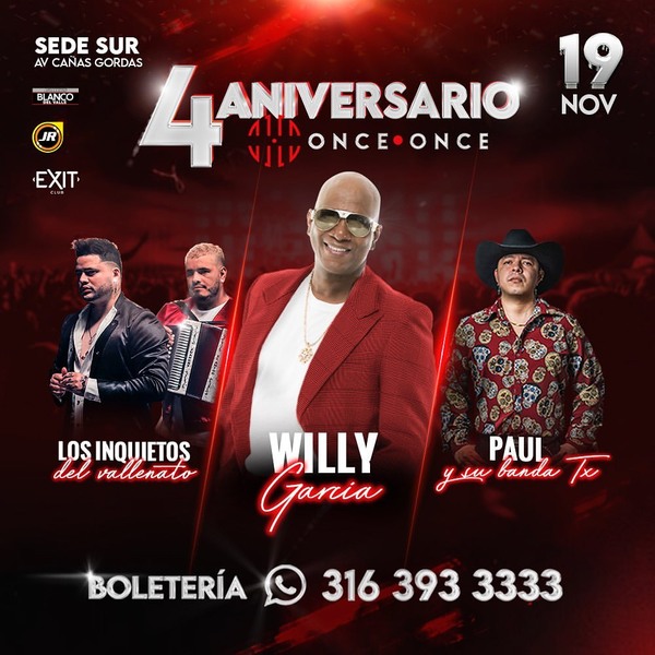 ESTE 19 DE NO IEMBRE VIVIRÁS Un concierto más íntimo mas privado, más exclusivo!! @willygarciacali @losinquietosdelvallenato llegan con todos sus grandes éxitos!! Lugar: @onceonce.cali Sede sur!! Ave. Cañas Gordas Boleteria: Wasap 3163933333 @exitclubcali @comunicarce