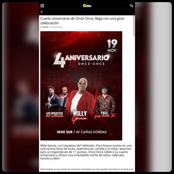 ESTE 19 DE NO IEMBRE VIVIRÁS Un concierto más íntimo mas privado, más exclusivo!! @willygarciacali @losinquietosdelvallenato llegan con todos sus grandes éxitos!! Lugar: @onceonce.cali Sede sur!! Ave. Cañas Gordas Boleteria: Wasap 3163933333 @exitclubcali @comunicarce
