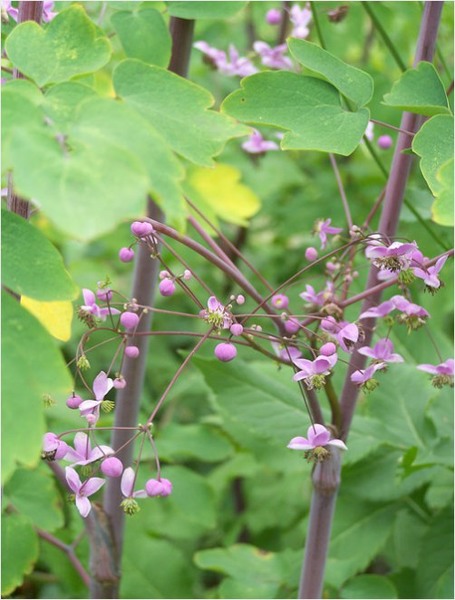 Lavender Mist Meadow Rue (Thalictrum rochebrunianum) with deep colored plant stalks shading the light pink flower petals.