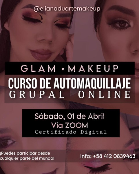 ✨Curso de Automaquillaje ONLINE✨ Siii muchas de ustedes que se encuentran en otras ciudades y otros países me lo han pedido y por fin, ya tenemos fecha🥺😍🎉 Si te encuentras en otra ciudad o en otro país, este curso es para ti✨ 🌸Incluye Certificado Digital (podrás imprimirlo en tu localidad). compartiré todo lo que necesitas saber para aprender a maquillarte desde cero como una profesional, aprenderás las técnicas más actualizadas para el maquillaje del día a día y te enseñaré a transformarlo para una ocasión especial. 💫BONUS: enseñaré tips para maquillar pieles maduras y pieles jóvenes, además enseñaré a corregir ojeras y manchitas en la piel. Por supuesto, por último y muy importante: ¡Aprenderás a abrir tu mirada y sacarle plus a tus facciones con mi técnica de contorno e iluminación! Con ella vas a crear un efecto de definición del rostro en la vida real con maquillaje. Envíale este flyer a esa personita que se encuentre lejos de ti y que sabes le podría encantar realizarlo☺️ Contamos con distintos métodos de pago para facilitar tu inscripción desde donde te encuentres🌎 📲Información completa vía WhatsApp: +58 412 0839463 ✨