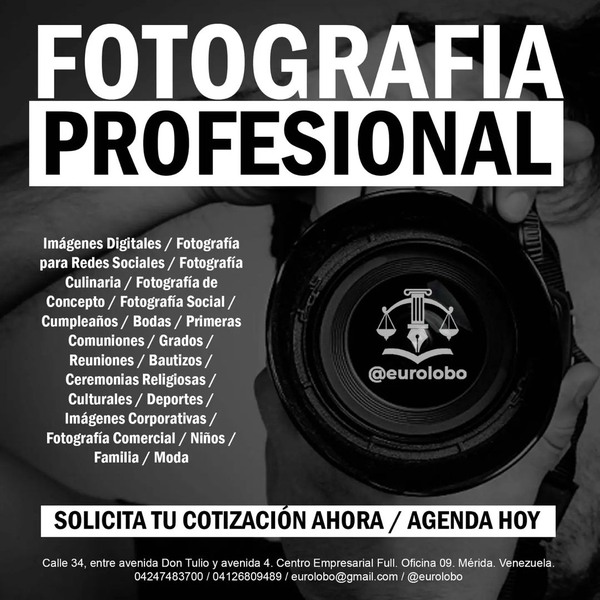 @eurolobo FOTOGRAFIA PROFESIONAL Imágenes Digitales / Fotografía para Redes Sociales / Fotografía Culinaria / Fotografía de Concepto / Fotografía Social / Cumpleaños / Bodas / Primeras Comuniones / Grados / Reuniones / Bautizos / Ceremonias Religiosas / Culturales / Deportes / Imágenes Corporativas / Fotografía Comercial / Niños / Familia / Moda SOLICITA TU COTIZACIÓN AHORA / AGENDA HOY Calle 34, entre avenida Don Tulio y avenida 4. Centro Empresarial Full. Oficina 09. Mérida. Venezuela. 04247483700 / 04126809489 / eurolobo@gmail.com / @eurolobo
