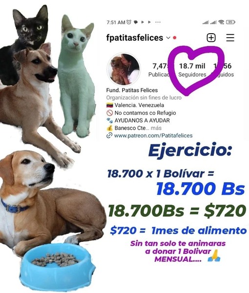 Y si, nos das un like❤️, comentas con un 💚 e invitas a un amigo a colaborar ??? . Si tan solo te comprometieras con 1 Bolívar MÉNSUAL.!! . Hay quien dice no es indiferencia, es situación país que no nos permite ayudar!, Pero y si tan solo donas 1Bolivar Mensual?? Ves todo lo que podemos lograr con 1bolivar si TODOS, se animarán ?? Por eso siempre decimos, TODO SUMA! Y se, que por poco que tengamos, al menos 1 o 2 Bs tenemos para ayudar., Solo hace falta solidaridad, compromiso y amor hacia la manada🐾🐾 . Seguimos con fe, seguimos de pie, parar no es una opción, son muchos 🐾🐾 los que dependen de mi! . . Feliz y bendecido día para todos🙏