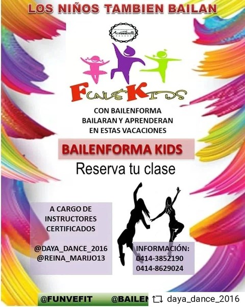 #REPOST @daya_dance_2016 with @get__repost__app BAILENFORMA KIDS♡☆♡☆ Y #Funvekids llego a Guayana y se hace presente. Los mas pequeños también bailan. Llevamos a nuestros niños una clase de Bailenforma Kids, llena de diversión y aprendizaje Corre y RESERVA TU CLASE Va dirigido a instituciones educativas, empresas de planes vacacionales, empresas o comunidades que quieran regarle a sus chamos un día diferente en estas vacaciones. Dirigido por instructores certificados por la Fundación Venezolana de Fitnes: ☆Lcda. Dayana de la Rosa y ☆María José Reina Se parte de nuestro trencito divertido bailable Kids.👩🏻👦🏽🧑🏽🧒🏻👧🏻👦🏻👶🏽💃🏻🥳🥳🥳🥳🥳💗🌟🌟🌟🌟 Para reservación de fecha comunícate a los siguiente números 0414-3852190/0414-8629024 @funvefit @daya_dance_2016 @bailenforma @reina_marijo13 . . . . @funvefit @bailenforma @funvefitguayana @funvefitgrancaracas @funvefitcolombia @funvefitperu @funvefitespaña #funvefitanzoategui #funvefit #bailenforma #funvefitdance #anzoateguifitness #Anzoategui #lecheria #lecheriafitness #wellness #barcelonaanzoategui #guanta #puertolacruzvenezuela #plc #mundofitness #venezuelafitness #venezuela #ciudadguayana #puertoordaz #ciudadguayanafitness #somosfunvefit #ccs #ccsfitness #ccsfit #caracas #caracasfitness #puertoordazfitness #ptordaz #tendenciafitness @anzteenamora @movimiento_venezolano @alcaldiabna @iamder.bna @anzoateguigob