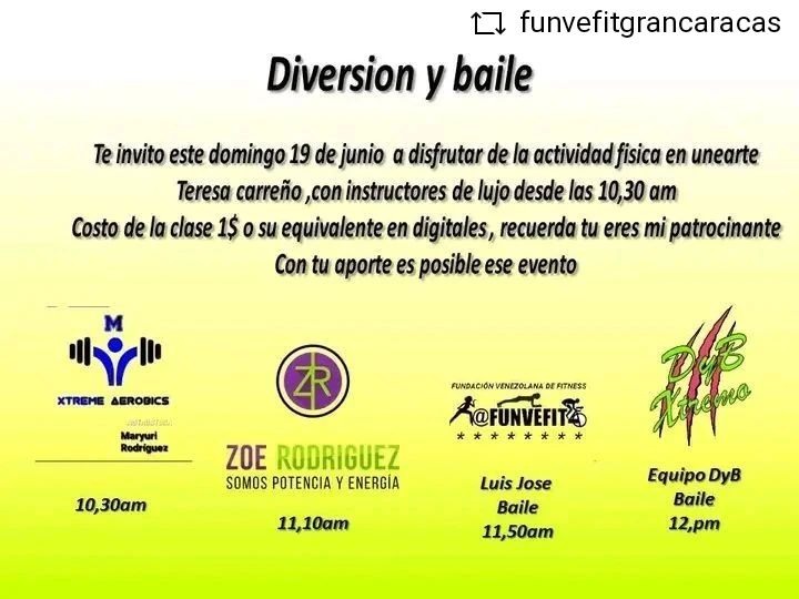 #REPOST @funvefitgrancaracas with @get__repost__app Este domingo actívate con @funvefit en Unearte . . . . @funvefit @bailenforma @funvefitguayana @funvefitgrancaracas @funvefitcolombia @funvefitperu @funvefitespaña #funvefitanzoategui #funvefit #bailenforma #funvefitdance #anzoateguifitness #Anzoategui #lecheria #lecheriafitness #wellness #barcelonaanzoategui #guanta #puertolacruzvenezuela #plc #mundofitness #venezuelafitness #venezuela #ciudadguayana #puertoordaz #ciudadguayanafitness #somosfunvefit #ccs #ccsfitness #ccsfit #caracas #caracasfitness #puertoordazfitness #ptordaz #tendenciafitness @anzteenamora @movimiento_venezolano @alcaldiabna @iamder.bna @anzoateguigob