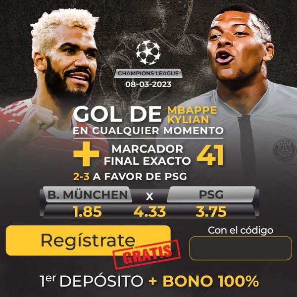 En tienes la Oportunidad de recibir GANANCIAS extras!馃挵馃挵 Reg铆strate con el c贸digo PARLEYGANADOR y Duplica tu primer Dep贸sito. *APROVECHA LA QUINIELA QUE HEMOS PREPARADO PARA TI*. APUESTA A LAS CUOTAS COMBINADAS EN EL PARTIDO DE LA CHAMPIONS LEAGUE Y 馃 *GANA CON EL PSG APOSTANDO A LAS CUOTAS ESPECIALES Y MBAPPE MAS DE 410.000 PESOS CON 10 LUQUITAS*. 馃挼馃挵 GANA con las mejores cuotas al Triunfo o el Empate, Primer Gol del Partido, Goles en la primera mitad, Goles exactos y mucho mas.鈿解毥 JUEGA, GANA 馃捀馃捀y SOBRE TODO COBRA, 馃馃con las Cuotas en Vivo y dale emoci贸n a cada Encuentro. 馃憠馃徏 HAZ CLICK AQUI: #MiCasino #Casinoenl铆nea #Casinoonline #Apuestasdeportivas #parleyganador
