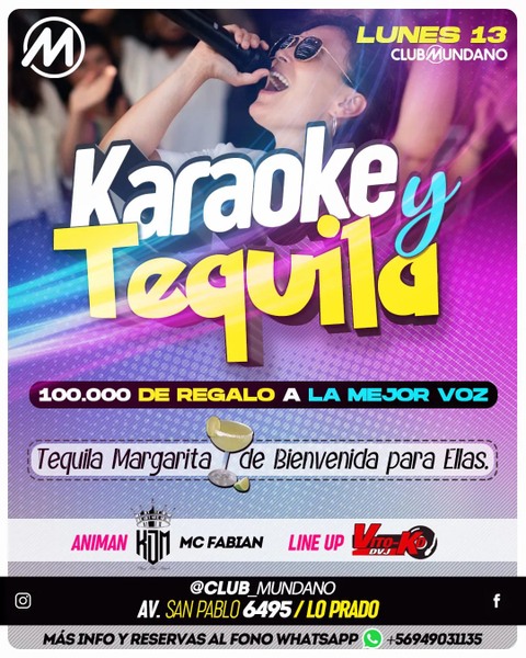 Canta, canta y gana en #ClubMundano🔥 Comenzamos la Semifinal del Festival Urbano y junto con ello regalaremos 100 mil pesos a la mejor Voz en nuestro #KARAOKEYTEQUILA 🎙️ Tequila Margarita GRATIS para ELLAS de BIENVENIDA! Av San Pablo #6495 Lo Prado.