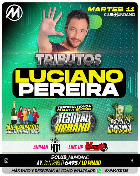 Hoy en nuestros #MartesdeTributos nos visita #lucianopereira 🎤 Todo esto y más junto a nuestra Tercera Ronda del Festival Urbano🎙️🔥 Mojito Tradicional de bienvenida para ELLAS hasta las 20:30hrs / Botella de Espumante al grupo de 4 Amigas. Av San Pablo # 6495, Lo Prado.