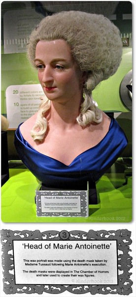 This wax portrait was made using the death mask (which was displayed in the Chamber of Horrors) taken by Mme. Tussaud following the execution of Marie Antoinette. See this at Madame Tussauds, Washington, DC.