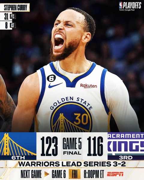 ¡Steph anotó 31 cuando los Golden State Warriors ganaron el Juego 5 De'Aaron Fox: 24 PTS, 7 REB, 9 AST Klay Thompson: 25 PTS, 5 3PM #NBAPlayoffs presentados por Google Pixel 📲: -