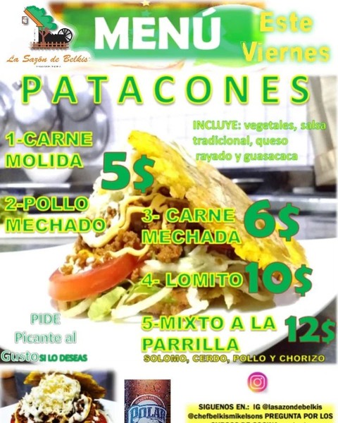 Desde Ya!!! tenemos "DELICIAS MEXICANAS" y PATACONES con diferentes preparaciones. Tales como :. Pollo, carne molida, carne mechada y un mixto a la parrilla que está brutal Dirección del Restaurante Calle 12 con Av 6y 7 cc Carafa local 8y9 San Felipe Yaracuy Telfs: 0254-2325923 0416-5602653 Redes sociales @lasazondebelkis, @chefbelkismikelsons y @oscarperoza Nuestro Horario de servicio Restaurante y Luncheria es: Luncheria de 8:30 a 12:30 Restaurante de 11:30 a 3:30 pm máximo 4 p.m. Y en la semana De Lunes a Sábado Y MUY PRONTO CENA TEMÁTICA SOLO LOS VIERNES de 4 p.m. a 9 p.m. Sin reservaciones o con reserva llamar al número de telf. 02542325923 04165602653 sigue nuestros amigos @pochove @loscuentosdemitierra #pa #viernes28 #hervido #comoencasa #platos #gourmets #cocinadeautor #abrimos #diciembre #2021 #lunes a #sabado #gastronomia #almuerzo #cocina #quedataencasa #venezuela #gastronomia #cocina #gastronomy #platos #gourmet #cocinar #regrann #instagram #yaracuy #sanfelipe #viernes #sanfelipeyaracuy #yaracuysanfelipe #dic ..