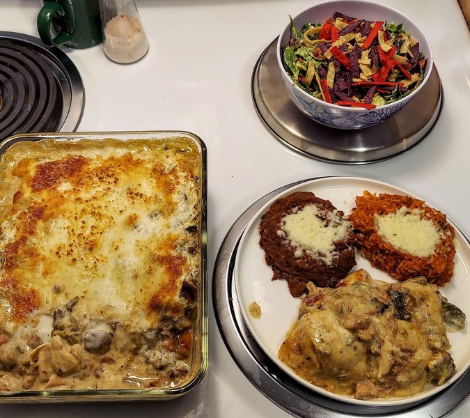 Tonight's Dinner: Enchiladas de Cerdo Frijoles Refritos Arroz Mexicano Ensalada [Shredded Pork Enchiladas, Refried Beans, Mexican Rice, Salad] To finish off the huge package of pork chops from this week's Food Co-op box I tossed the ribs trimmed to make last night's Country Fried Steak (extra portions were one to a friend and the other frozen for later) into the slow cooker, added some weak chicken stock to jus them, then seasoned the remaining 3 chops for Mexican and layed over ribs to slow-cook overnight. This morning the chops practically shredded themselves just lifting them out of the pot! To the shredded pork I added minced Anaheim peppers and onions, Oaxaca Queso, and stuffed tortillas with the mixture to make a casserole. Topped Enchiladas with my homemade Chili Verde, Queso Blanco, and Cojita before baking an hour. Pinto Beans simmered all day to make the refritos, and brown steamed with peppers, onions, tomatoes, and spices while the Enchiladas baked. Served with a sprinkle of Cojita and tossed salad - muy bueno! #TonightsDinner #EnchiladasCerdo #Frijoles #Refritos #Arroz #Mexicano #ShreddedPork #Enchiladas, #Beans #Rice #Salad