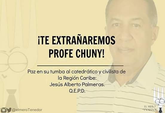 Ayer sufrimos la perdida de este grande de la academia, el Maestro Jesús Alberto Palmera Guerra, conocido como el Chuny. Todos los que tuvimos el honor de ser sus alumnos sabemos que era el "colador" de la universidad, por su excelencia, su calidad profesional; Chuny era sinónimo de esfuerzo, de estudio, de amor a las leyes, gracias a él amé un poco más el Derecho Civil. Esas jornadas de parciales en lo cuáles era estrictamente necesario no dormir la noche anterior para estudiar. Solo él con su excelente y particular pedagogía hacia de los matachos la perfecta explicación de lo que era una sucesión. Hoy al despertar encuentro está imagen y no pude evitar sentir más el dolor de su ausencia, porque estoy consiente de que nuestra región perdió a un excelente Maestro, es entonces cuando recuerdo que tuve el privilegio y la suerte de pisar su biblioteca, la que hoy para mí, es un santuario, si, un santuario así sin exagerar, porque la excelencia y la grandeza hay que destacarla aunque deba sobreactuarme. Hoy ya no estás y no estoy segura si estás consientes de todo el dolor que dejas no solo en tu familia, sino en todos los que te conocimos, en el cariño tan grande que te tenemos todos los que fuimos tus alumnos, ojalá que si lo percibas... Buen viaje Maestro, descansa en paz, Titan.