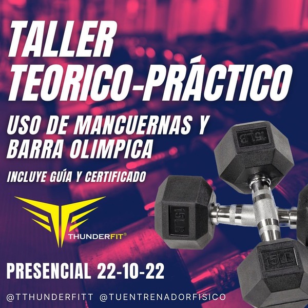 Todo lo que debes saber para dominarlas. ✅Métodos y pro de entrenamiento específicos. ✅Técnicas básicas y avanzadas de uso. ✅Patrones de movimientos para desarrollar todos los músculos. Anatomía funcional y Análisis de movimiento. Conviértete en experto y aumenta tus ingresos. Dirigido a profesionales y aficionados. 100% presencial Duración 7hrs Incluye: Certificado físico y digital avalado por la compañía y marca registrada Sport and Fitness Thunderfit. Guía digital Refrigerio Lugar: Espacio Thunderfit. Centro comercial Plza las Americas 1. Fecha Sábado 29 de Octubre Hora 10:30am a 5:30pm