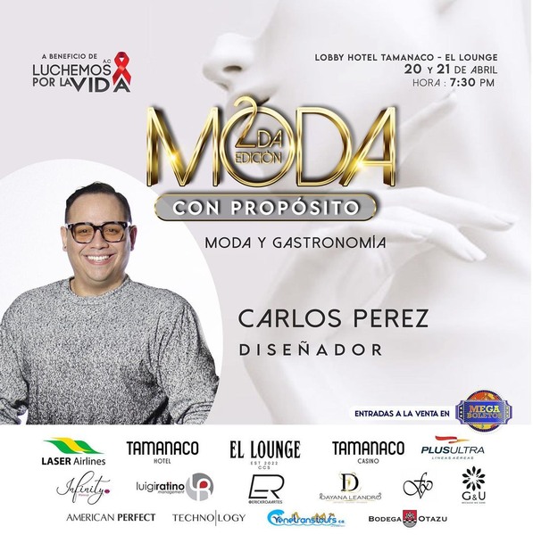 Presente en nuestra segunda edición de @modaconpropositoplus nuestro querido diseñador @carlosperezofficial este 20 y 21 de abril en el @elloungeccs del @hoteltamanaco entradas a la venta por @megaboletos a beneficio de @acluchemosporlavida @fundaluchemosvidausa