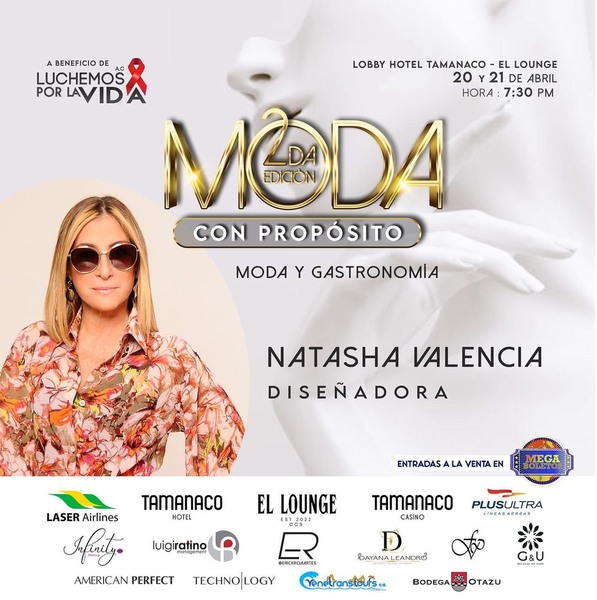 Presente en nuestra segunda edición de @modaconpropositoplus nuestro querido diseñadora @natashamoda este 20 y 21 de abril en el @elloungeccs del @hoteltamanaco entradas a la venta por @megaboletos a beneficio de @acluchemosporlavida @fundaluchemosvidausa