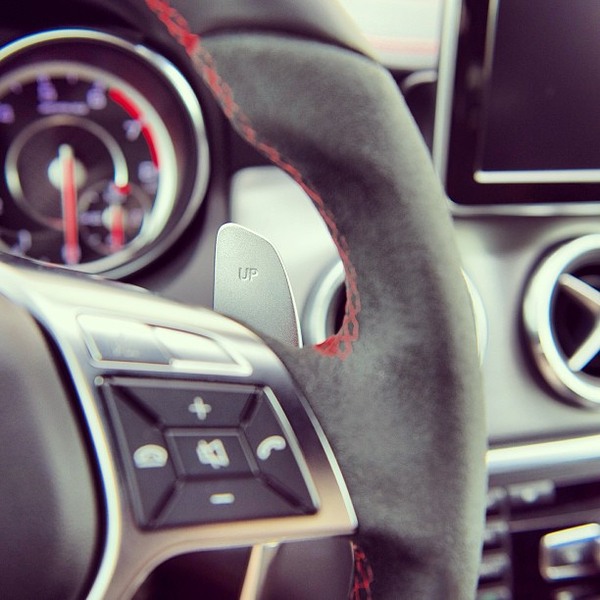 Up up and away! Do you know a beautiful curvy road in your surroundings that you would recommend for a fun ride with the new #Mercedes #CLA 45 #AMG [Mercedes-Benz CLA 45 AMG | Combined fuel consumption: 6.9 l/100km | CO2 emission: 161 g/km] #mercedesbenz #paddles #steering #detail