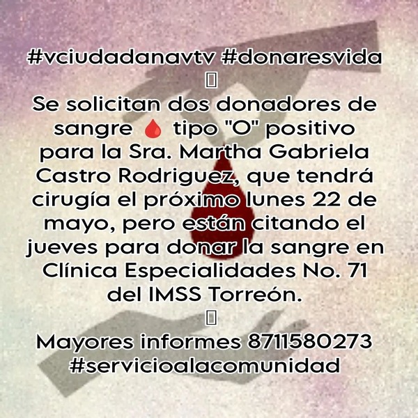 #vciudadanavtv #donaresvida Se solicitan dos donadores de sangre 🩸 tipo "O" positivo para la Sra. Martha Gabriela Castro Rodriguez, que tendrá cirugía el próximo lunes 22 de mayo, pero están citando el jueves para donar la sangre en Clínica Especialidades No. 71 del IMSS Torreón Mayores informes 8711580273 #torreon #coahuila #comarcalagunera #gomezpalacio #ciudadlerdo #durango #servicioalacomunidad